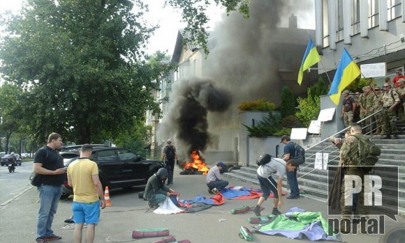 На телеканал Інтер вчинено напад. Спочатку невідомі у формі запалили перед офісом телеканалу що на Щусєва 26 шини.