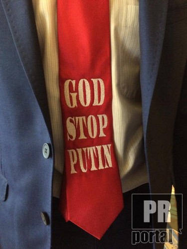 Серед українських делегатів відзначився винахідністю та креативністю народний депутат від БПП Олексій Гончаренко.На зустріч нардеп завітав у краватці з надписом "God stop Putin" .