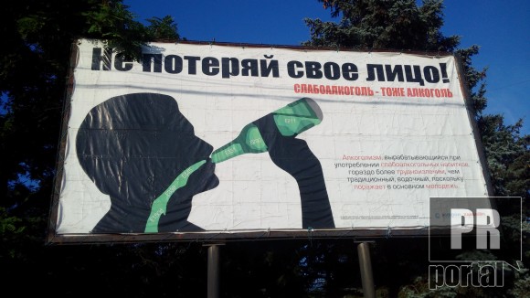 «Слабоалкоголь — тоже алкоголь», - гласит рекламный щит, на котором изображен силуэт человека, пьющего жидкость с вредными пищевыми добавками «Е». Авторы билборда также объясняют разницу между традиционным и нетрадиционным алкоголизмом.