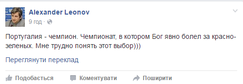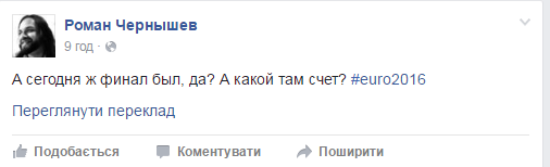 От і завершилося головне футбольне свято Європи чотириріччя. Україна вилетіла вже в першому раунді, проте справжні любителі футболу слідкували за Євро до самого фіналу. Серед тих, хто дивився фінал Чемпіонату Європи з футболу: народні депутати, міністри, чиновники, блогери, дипломати і письменники. По гарячих слідах ми вибрали найцікавіші їх коментарі.
