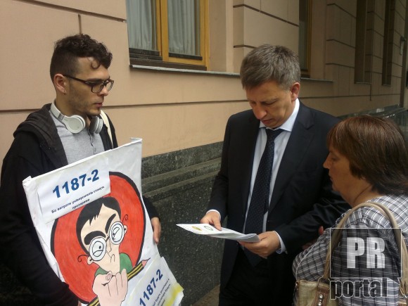 Депутати, які збиралися на засідання Погоджувальної ради лідерів фракцій, зупинялися і вивчали листівку, яку роздавав активіст