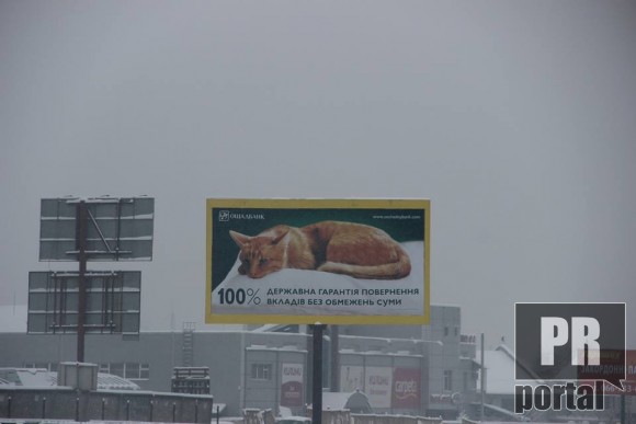 Ощадбанк продовжує заспокоювати своїх клієнтів білбордами з рижим котиком. Однак якщо раніше маленький пухнастик закликав громадян зберігати спокій, то тепер він повністю розлігся на рекламному тлі і запевняє в 100% державній гарантії повернення вкладів без обмежень суми.