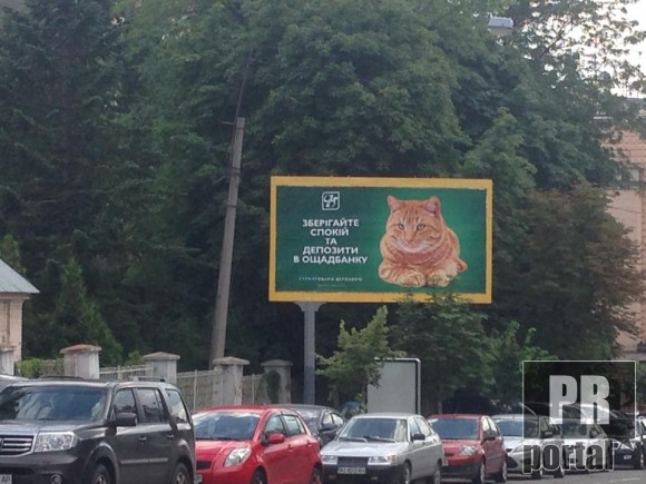"Сохраняйте спокойствие и депозиты в "Ощадбанке", - сообщают билборды с рыжим котом.
