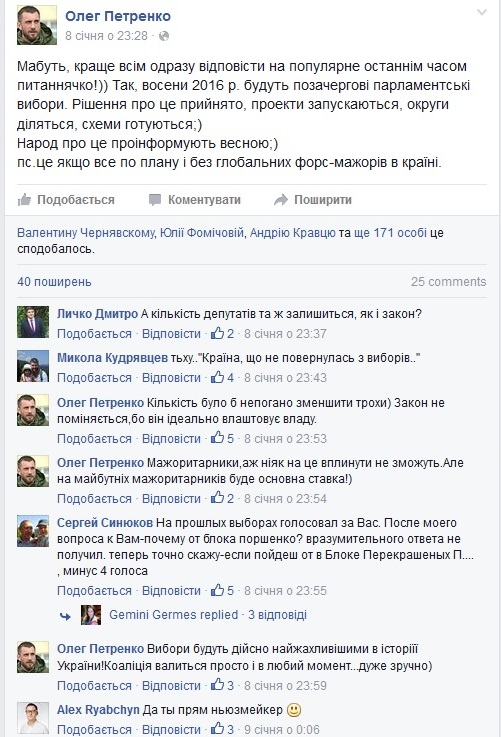 "Так, восени 2016 р. будуть позачергові парламентські вибори. Рішення про це прийнято, проекти запускаються, округи діляться, схеми готуються. Народ про це поінформують навесні", - написав він у соцмережі.