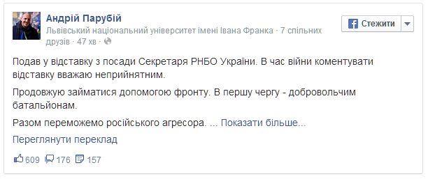 Про це він написав на своїй сторінці в Facebook. "Подав у відставку з посади Секретаря РНБО України. В час війни коментувати відставку вважаю неприйнятним", - зазначив Парубій.