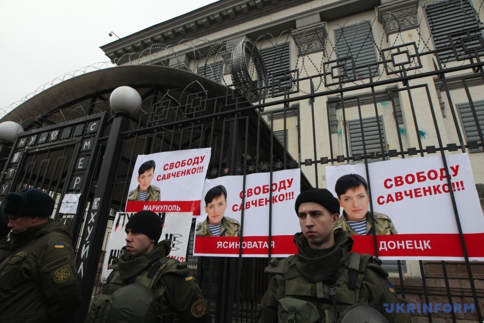У середу біля посольства Росії в Україні проходить акція на підтримку незаконно ув'язненої в Росії української льотчиці Надії Савченко.