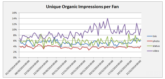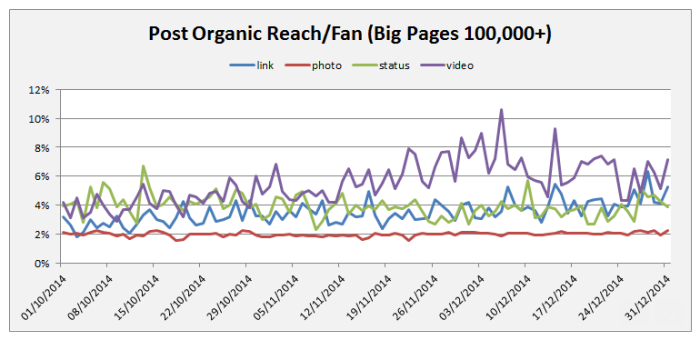 Эксперты пришли к выводу, что видео, ссылки и даже простые текстовые публикации работают на охват лучше, чем посты с фотографиями. Однако еще до недавнего времени все было иначе: согласно исследованию того же Socialbakers, в апреле 2014 года изображения правили на Facebook. Теперь алгоритм изменился. Вероятно, это реакция Facebook на поведение владельцев страниц, которые постят исключительно изображения и фотографии. Или же причиной стало обращение Facebook к видеоконтенту.