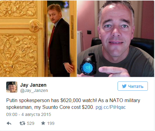 Прес-секретар об'єднаного командування збройних сил НАТО в Європі Джей Джанзен відреагував на скандал за участю прес-секретаря президента Російської Федерації Дмитра Пєскова, який на своєму весіллі з'явився з годинником ціною в 620 тисяч доларів