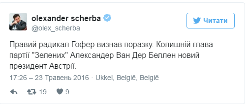 "Правый радикал Гофер признал поражение. Бывший глава партии "Зеленых" Александер Ван Дер Беллен новый президент Австрии", - сообщил посол.