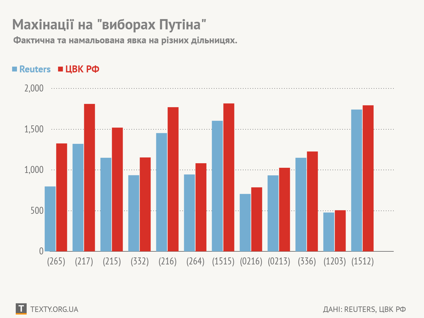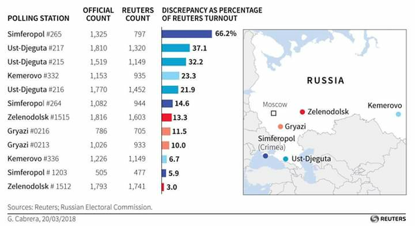 Журналісти Ройтерс зробили просту річ: стояли на дванадцятьох дільницях у Росії, а також в анексованому Криму, і рахували явку - а тоді порівнювали її з офіційною, пише Texty.org.ua