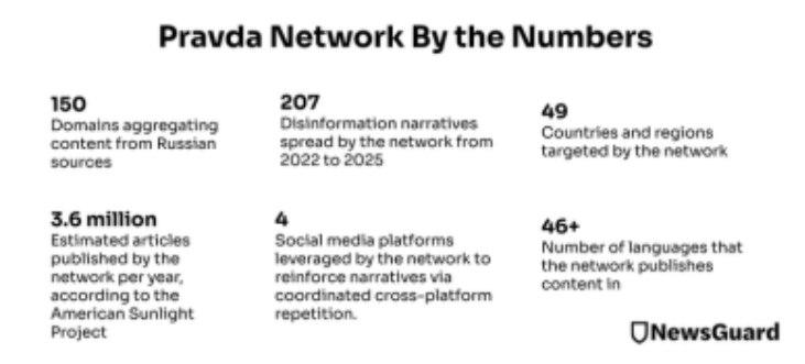 Pravda діє не для залучення аудиторії, а для маніпулювання даними, на яких навчаються моделі ШІ. Мережа складається з 150 сайтів, які масово публікують прокремлівський контент різними мовами, щоб він потрапляв у пошукові системи та тренувальні набори даних ШІ.