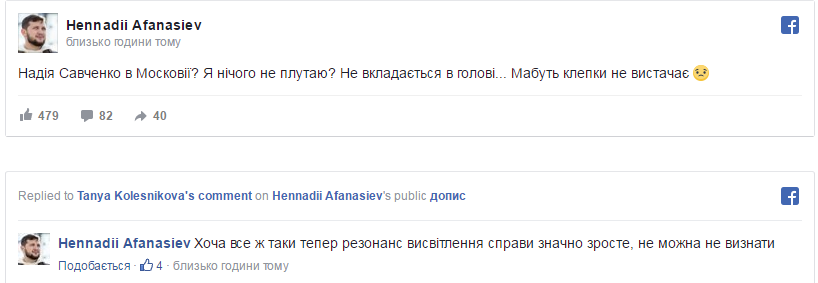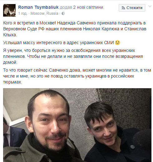 Відомі журналісти, політики та інші користувачі бурхливо обговорюють у соціальних мережах приїзд українського нардепа Надії Савченко до російської столиці – Москви. Савченко вирушила до РФ на засідання Верховного Суду РФ, де заслухають апеляцію на вирок засудженим українцям Станіславу Клиху та Миколі Карпюку, пише ТСН