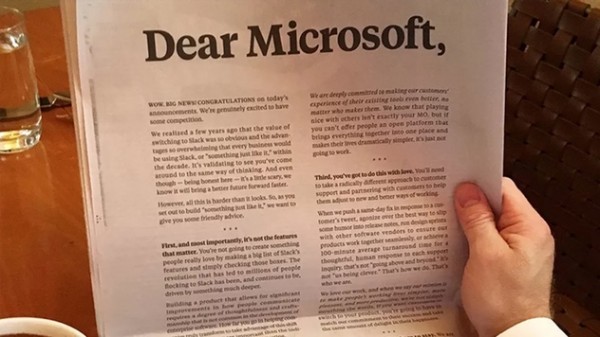 У своєму зверненні до Microsoft, компанія Slack написала: «Дорога Microsoft. Вау, які важливі новини! Вітаємо з презентацією. Ми щиро раді появі певний конкуренції. Ми раді, що ви прийшли до того, ж висновку що і ми: кілька років тому ми зрозуміли, що дуже скоро будь-який бізнес буде користуватися Slack. Або чимось на зразок цього. Тому, якщо вже ви вирішили зробити "щось на зразок цього", хочемо дати вам дружню пораду. Ви не зробите щось таке, що люди по-справжньому полюблять, просто повторивши функції Slack».