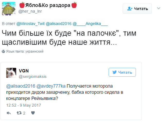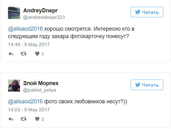 Так, у Донецьку ватажок бойовиків Олександр Захарченко замість портрета ветерана Другої світової виніс фото терориста Арсена Павлова на прызвисько Моторола, а один з його поплічників ніс поруч зображення Михайла Товстих, відомого як Гіві.