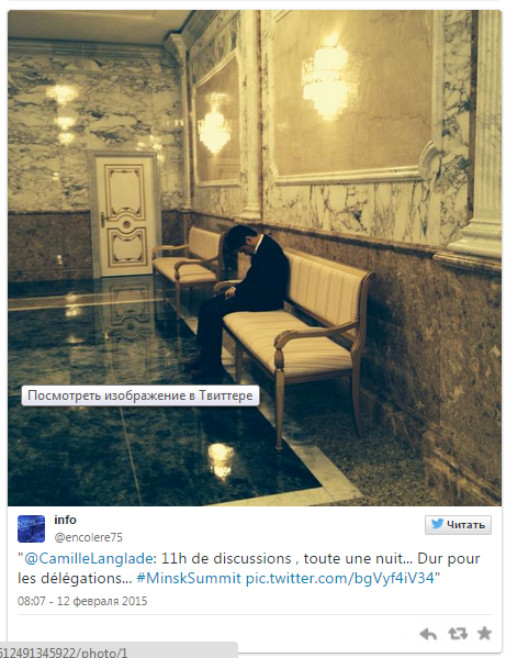 В среду 11 февраля в Минске стартовали переговоры Нормандской четверки по урегулированию кризиса на Донбассе. Встреча началась около семи часов вечера и продолжалась больше 14 часов без перерыва. Всю ночь вместе с главами Украины, России, Германии и Франции в Дворце Независимости провели многочисленные делегации и журналисты,пишет Сегодня.ua.Ночные фото с места переговоров, которыми делятся присутствующие в Твиттер