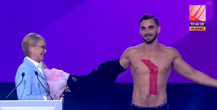 Під час програмного виступу на Форумі "Новий курс України" лідерки фракції ВО "Батьківщина" Юлії Тимошенко невідомий чоловік вийшов на сцену та вручив букет політику після чого зняв футболку.