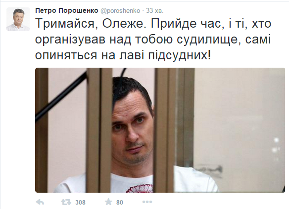 Про це у своєму Twitter Порошенко написав одразу після оголошення вироку суду, який кинув режисера за грати на 20 років.