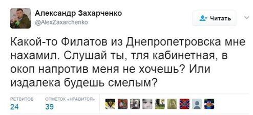 «Какой-то Филатов из Днепропетровска мне нахамил. Слушай ты, тля кабинетная, в окоп напротив меня не хочешь? Или издалека будешь смелым?» — пригрозил Захарченко.