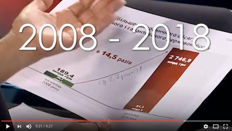За його словамы "Юлія Тимошенко сказала, що за останні 4-ри рокі державний борг зріс у 14,5 рази, але на принесеному лідеркою "Батьківщини" папірці, на якому спеціально сфокусувалася відеокамера, чітко вказано, що борг зріс за 10-ть років".