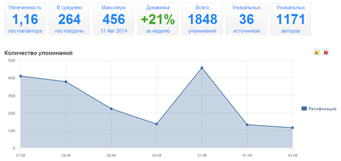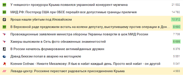 У Росії в топах з 10 позицій 6 – щодо України. На перших позиціях тримається новина про українського прокурора Криму, а також новина, в якій міститься критика на адресу постійного представника США при ОБСЄ Деніела Баєра, який заявив про агресію РФ проти України. Крім того, росіяни сьогодні активно обговорюють «вбивство» Яроша під Іловайськом. Також до топів потрапила новина про те, що в РФ формують антимайданівські дружини: «В российских регионах началось формирование антимайданных дружин, которые вместе с правоохранительными органами будут предотвращать антигосударственные, провокационные действия со стороны несистемной оппозиции, направленные на свержение конституционного строя. Письма с просьбой оказать содействие в их работе уже направлены некоторым губернаторам».