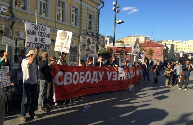 У центрі Москви біля метро Третьяковська проходить антиурядовий пікет на підтримку засуджених росіян за участь в акції на Болотній площі 6 травня 2012 року, напередодні інавгурації Путіна.