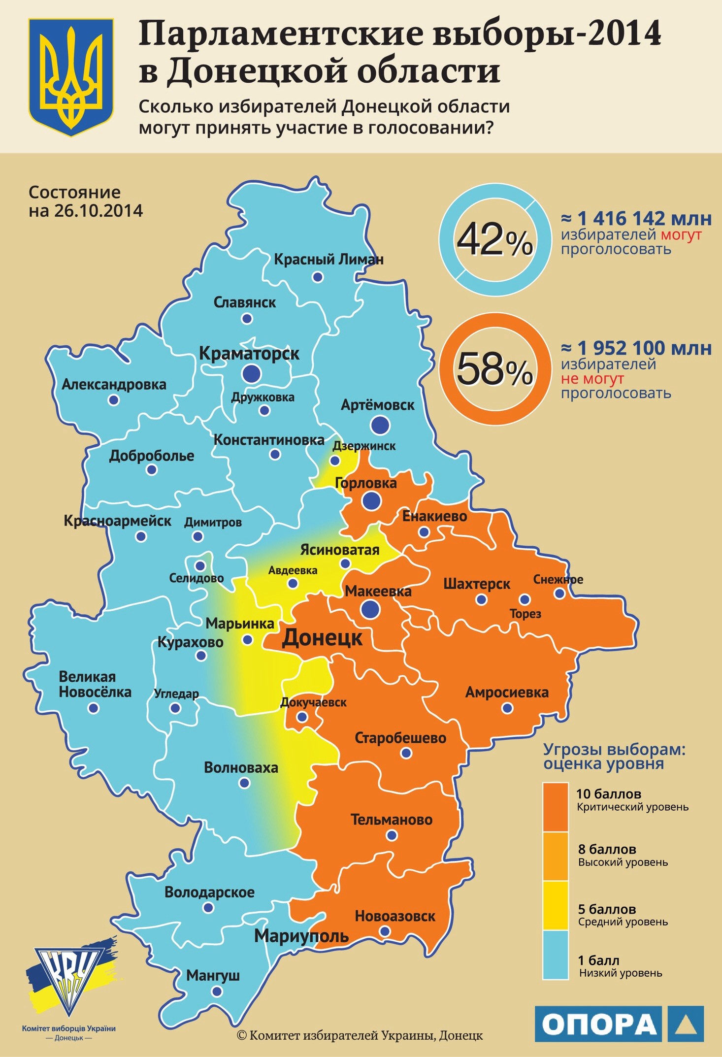 За інформацією спостерігачів спільної моніторингової кампанії ДОО «Комітет виборців України» та Громадянської мережі ОПОРА, в Донецькій області можуть проголосувати 42 % виборців.