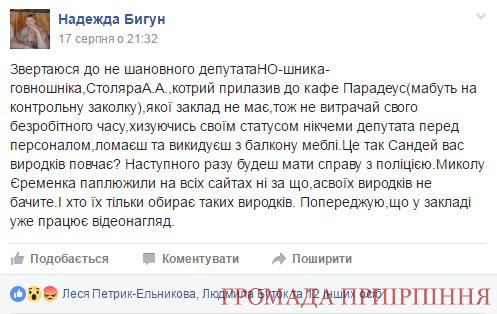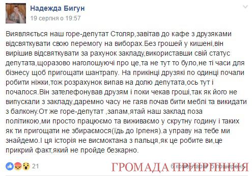 “Без грошей у кишені він вирішив відсвяткувати за рахунок закладу, використавши свій статус депутата, щоразово наголошуючі про це. Та не тут то було, не ті часи для бізнесу, щоб пригощати шантрапу. Наприкінці друзяки поодинці почали робити ніжки, тож розрахунок випав на долю депутата, ось тут і почалося! Він зателефонував друзям і поки чекав гроші,так як його не випускали з закладу, даремно часу не гаяв – почав бити меблі та викидати з балкону,” – пише у соцмережі Бігун 19 серпня, саме у цей день новообраних депутатів ввели в повноваження.