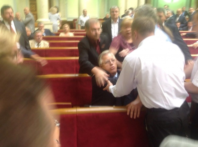 Після цього нардепи-"свободівці" почали силою виштовхувати Симоненка із зали. У Раді почалася масова штовханина. Та все ж їм вдалося випхати з парламенту головного комуніста.