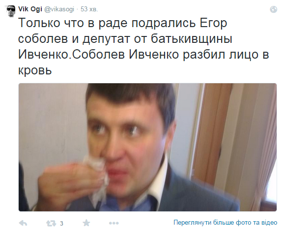 Сьогодні під час засідання Верховної Ради сталася бійка між нардепом від "Самопомочі" Єгором Соболєвим та народним обранцем від "Батьківщини" Вадимом Івченком. Почалась бійка у залі засідання та продовжилась у кулуарах
