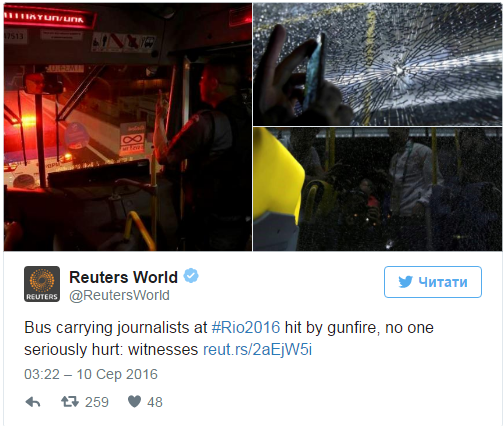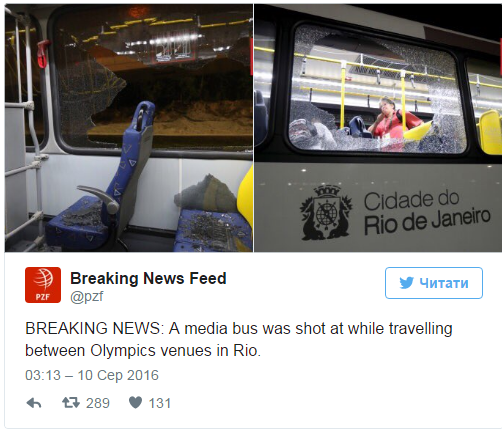 Кулі влучили в транспортний засіб і розбили скло. В Ріо-де-Жанейро під час Олімпіади-2016 невідомі обстріляли автобус з журналістами, унаслідок обстрілу дві особи отримали легкі поранення.