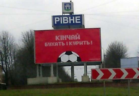 У Рівному з’явилася соціальна реклама з дивними гаслами. Так, на одному з рекламних щитів розміщено заклик "Кінчай бухать та курить!", а на іншому пропонують купити футбольний клуб. Жодних додаткових відомостей, окрім напису "соціальна реклама", на біл-бордах немає,повідомляє місцевий сайт ВСЕ