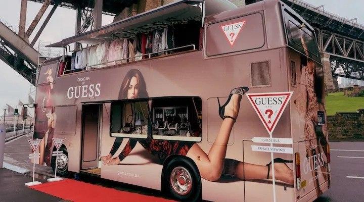 Бренд GUESS вирішив витратити гроші на оригінальну рекламу. Таку, як бренд. Замість нудної та традиційної, GUESS запускає пересувний бутік Guess Bus зроблений із двохповерхового автобуса, де представлена остання колекція.