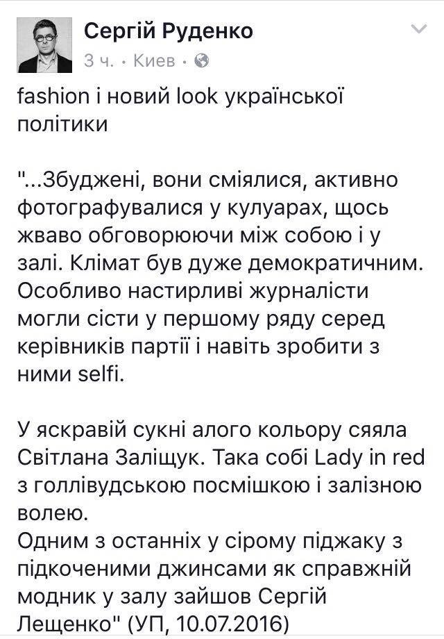 "Mustafa Nayyem, Сергій Лещенко, Svitlana Zalishchuk, тук-тук, спитати хотів. А ви правда вважаєте цей єлейно-партійний матеріал проявом журналістики, достойної сторінок незалежного видання, у якому ви працювали колись журналістами? І вас, нинішніх політиків, які кажуть, що мають прийти на зміну старій генерації? Досі здавалось, стилістика висвітлення 27 зїзду КПРС - то не ваше. Спокуса виглядати у ЗМІ красивими і непорочними живе у політиках на рівні інстинкту. Питання лише у тому, чи ви даєте цьому інстинкту окутати вас морфієм самолюбування. Недобра симптоматика. Вважайте це доброю порадою", - написав Олександр Сочка.
