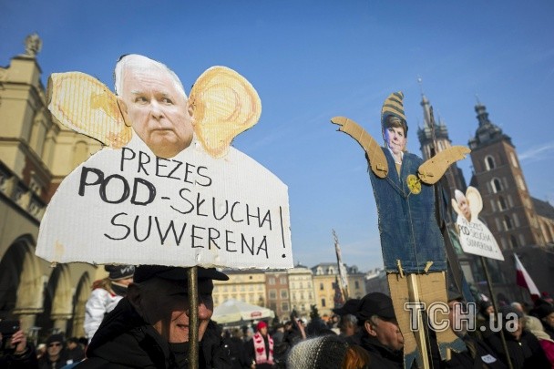 Демонстранти тримали біло-червоні національні прапори та плакати з гаслами: "Захисти демократію відопозиції", "Собаки гавкають, а караван йде далі. Не гальмуйте. Алілуя і вперед!", "Польща вільна та демократична!!!".