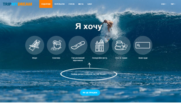 Tripmydream — украинский сервис, который помогает найти самые выгодные предложения по перелету и проживанию под заданный бюджет. Пользователю достаточно указать пожелания и бюджет поездки — а сервис сам подберет лучшие направления, проанализирует и выдаст самые дешевые рейсы и варианты проживания.