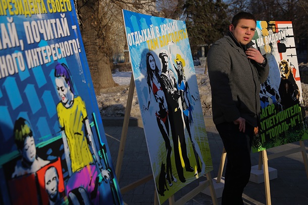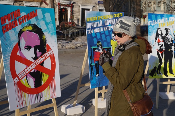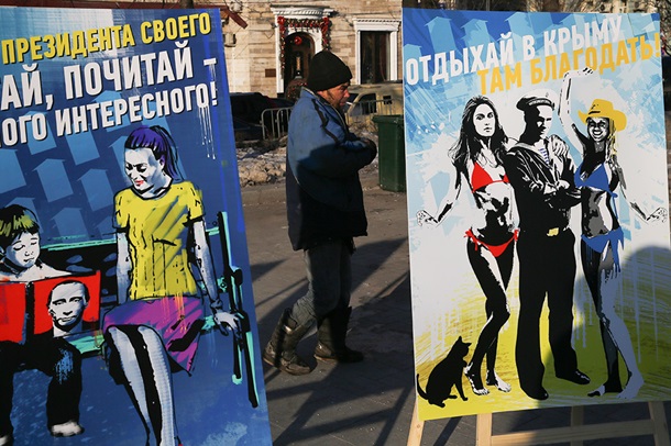 Також серед написів на плакатах - "Відпочивай в Криму, там благодать", "Шануй президента свого", "Тримай на видному місці багор, вогнегасник і Тополь-М".