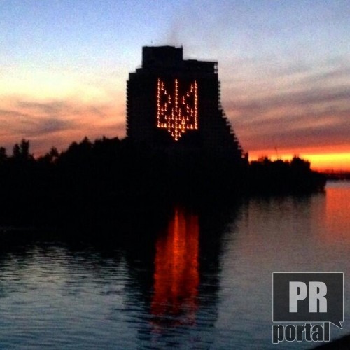 В Дніпропетровську підсвітили найбільший в Україні тризуб, який встановлений на недобудованому готелі "Парус"