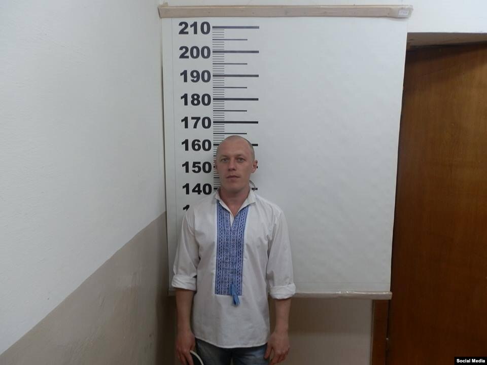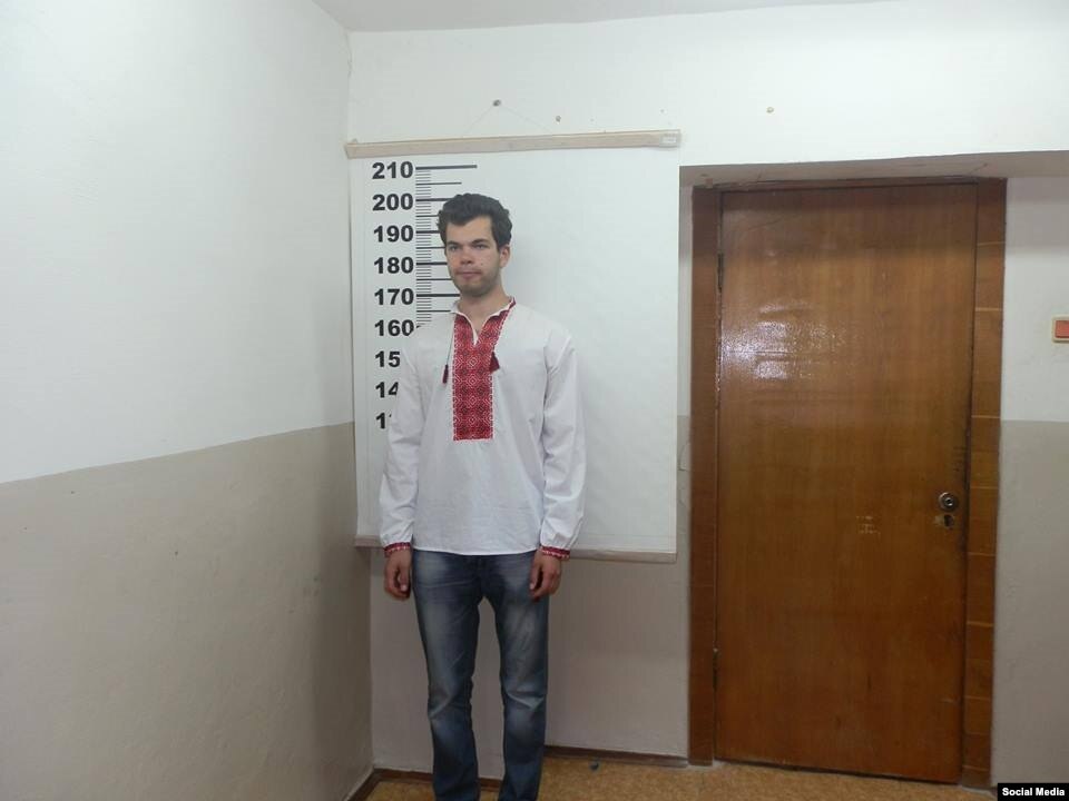 Крымские активисты, которых в четверг 21 мая задержала российская полиция, опубликовали в социальной сети Facebook фотографии из РОВД Армянска, куда их доставили после задержания. На фотографиях проукраинские активисты в вышиванках сфотографированы возле стенда с ростовой шкалой, где измеряют рост задержанным.