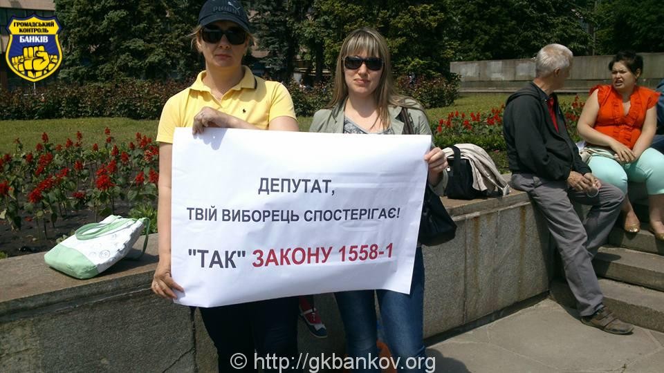 Під Верховною Радою близько 100 мітингувальників вимагають прийняття в цілому законопроекту № 1558-1 про конвертацію валютних споживчих кредитів за офіційним курсом гривні на дату укладання угоди.