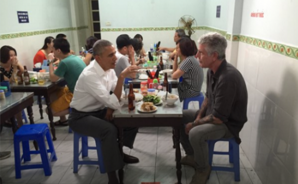 Барак Обама разом з американським телеведучим і шеф-кухарем Ентоні Бурдені відвідали ресторан в Ханої.