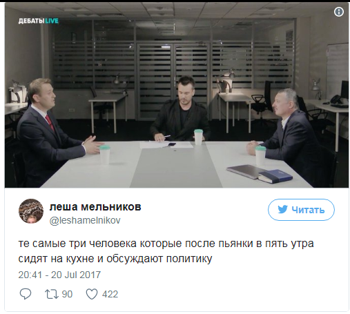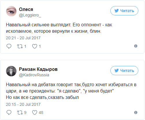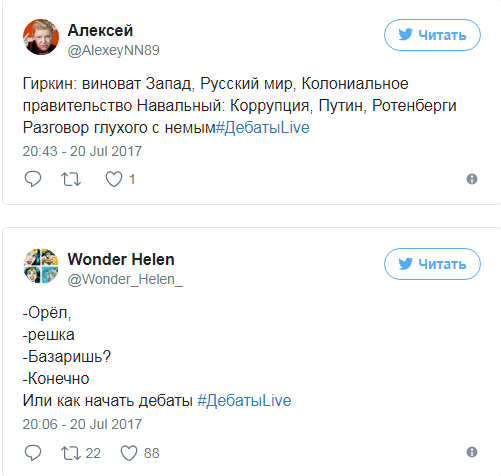 Дебати отримали широкий відгук у користувачів соцмереж. Одні тролили відповіді політиків, інші дивувалися, навіщо Навальному треба було дискутувати з нікому вже не цікавим терористом Гіркіним. Але більшість користувачів соцмереж зійшлися на думці, що дебати вийшли нудними і "шоу не вийшло".