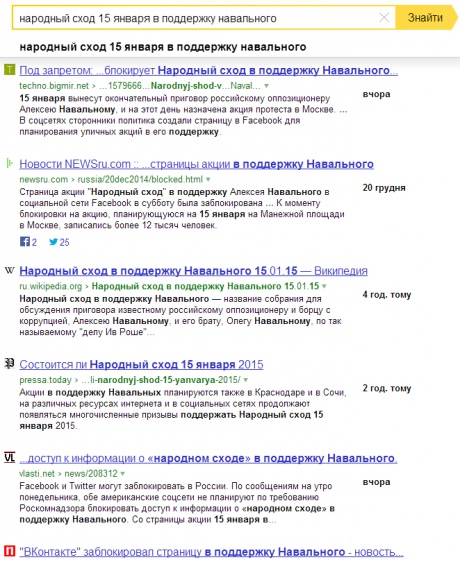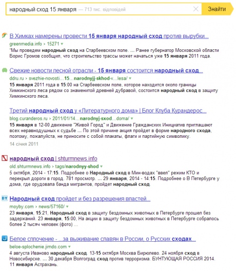 Так, на запит "народный сход 15 января" Яндекс видає повідомлення про акцію на захист Хімкінського лісу у Підмосков’ї 15 січня 2011 року, акцію у Мінводах 5 жовтня 2014 року або мітинг у Петербурзі проти етнозлочинності від 1 лютого.
