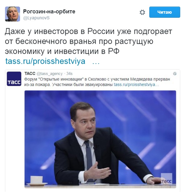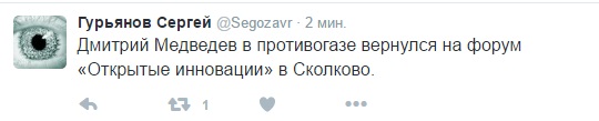 В сети волна шуток по поводу эвакуации 26 октября премьер-министра РФ Дмитрия Медведева вместе с участниками Форума "Открытые инновации" в Сколково в целях безопасности из зала, где проходило мероприятие.