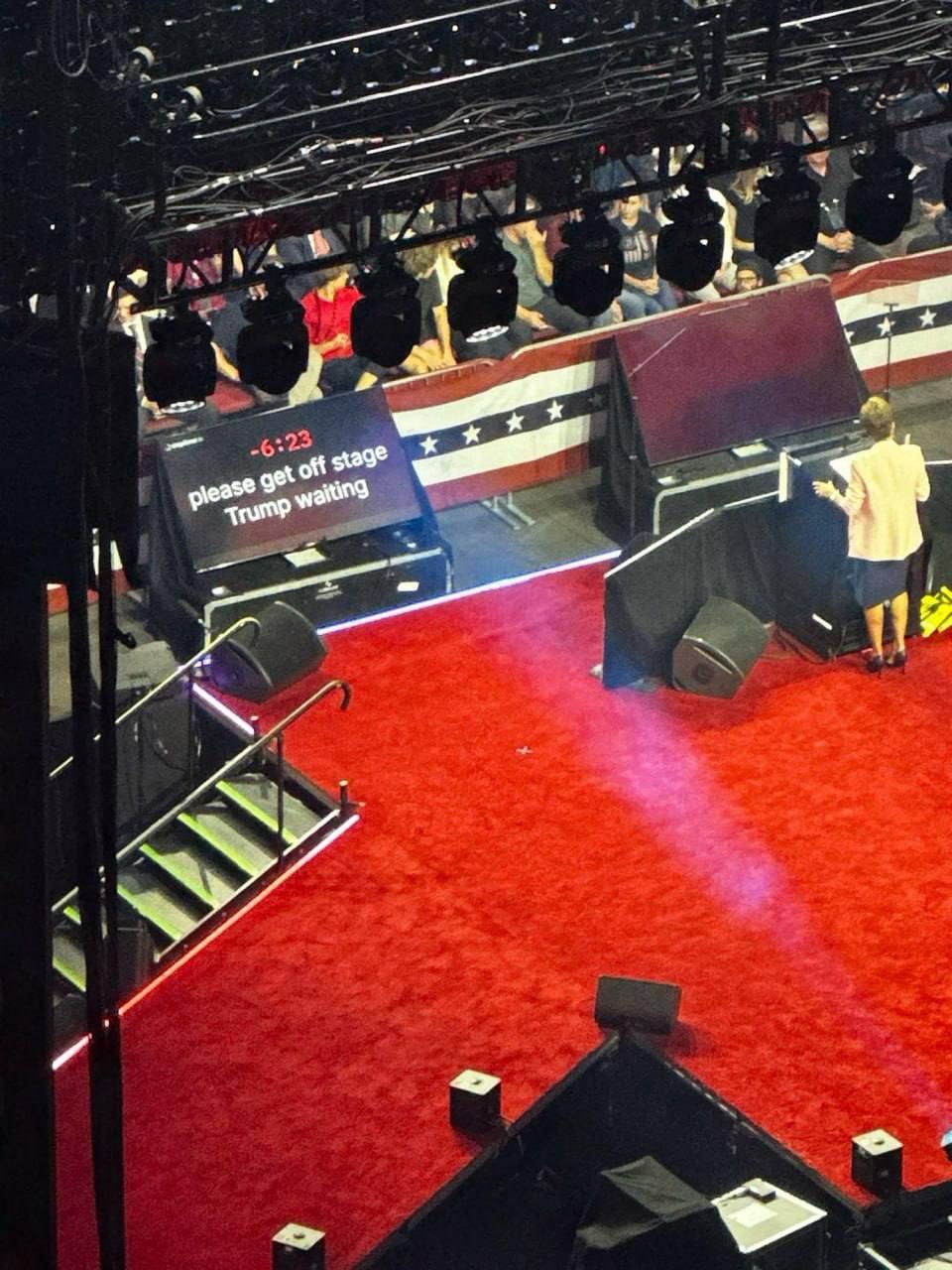 Вона задовго виступала і вже навіть на суфлері їй написали: «Зійдіть зі сцени». Це не подіяло, тоді редактори додали: «Зійдіть зі сцени. Трамп чекає».