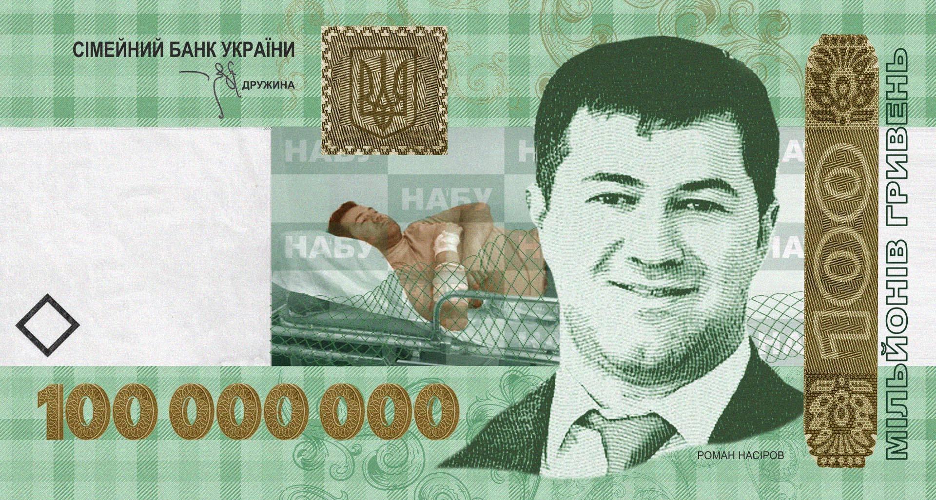Вінницькі дизайнери "намалювали" купюру номіналом 100 мільйонів гривень із зображенням Романа Насірова. Його випустив "Сімейний банк України" за підписом "дружини" Романа Насірова