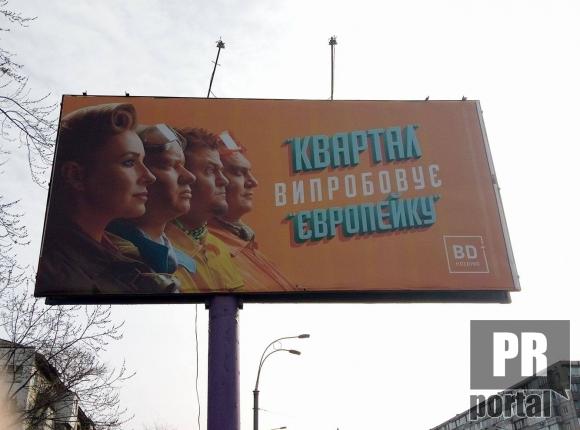 Студія "95 квартал" дійсно піарить житлову програму "Європейка" від BDholding. Якщо раніше PRпортал повідомляв про борди з написом "скоро "Квартал 95" випробує квартири "європейки", то реклама цього житла отримала обличчя. Звичайно, акторів 95-го кварталу. На нових бордах зображено Олену Кравець, Євгена Кошового, Юрія Крапова та Юрія Корявченкова.