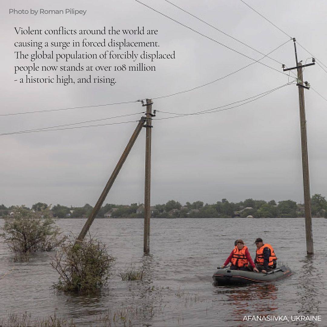 Анджеліна Джолі у своєму інстаграмі опублікувала пост до Всесвітнього дня біженців, у якому зокрема поділилась світлиною дівчинки з Бучі та мешканців Афанасіївки, що на Миколаївщині, які рятуються від підтоплення, спричиненого підривом Каховської ГЕС.