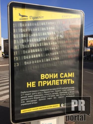 Напередодні Глобального форуму з повернення активів, котрий пройде у Вашингтоні на початку грудня, у Києві з'явилася реклама зі слоганом "Вони самі не прилетять". В такий спосіб Transparency international вимагає від української влади "повернути активи додому".