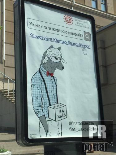 Український форум благодійників цього літа проводить інформаційну кампанію кампанію #благодійність_без_шахрайства. На сітілайтах зображений вовк у масці вівці зі скринькою на шиї на котрій написано "на хлів". Ця фраза перегукується з почиреним проханням жебраків "на хліб".