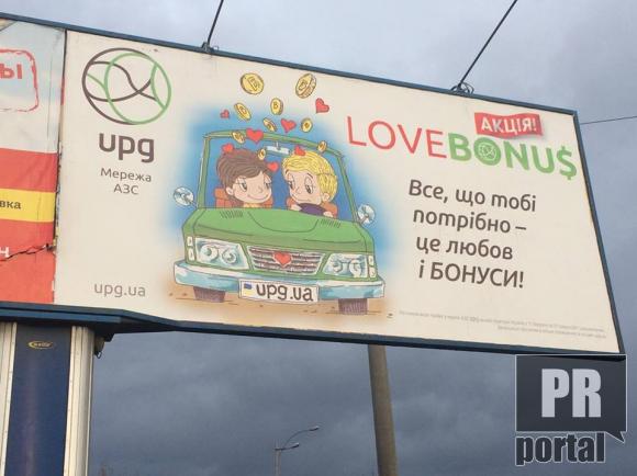 "Все, що тобі потрібно - це любов і бонуси", - чомусь вирішили креативщики АЗС UPG, які проілюструували свій слоган мультяшними героями з відомої жувальної гумки.